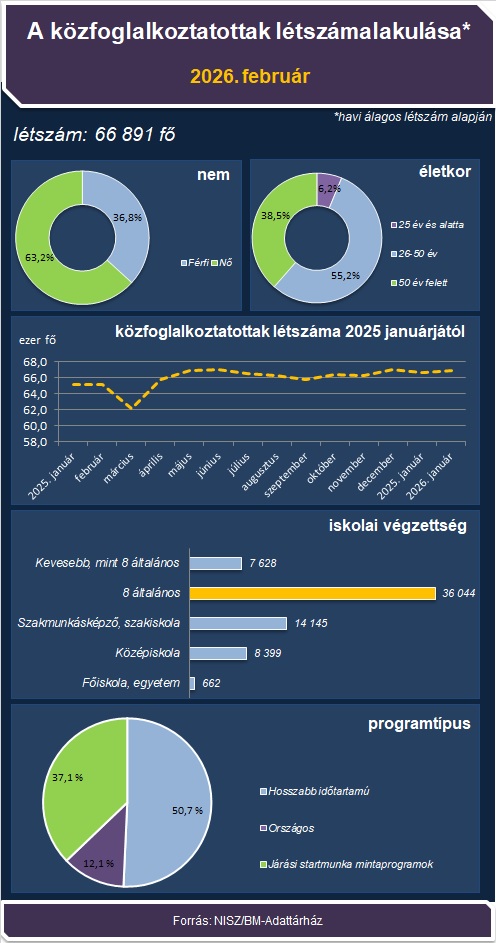 A közfoglalkoztatásban részt vevő személyek havi átlagos száma 2026 februárjában 66,9 ezer főt tett ki, amely az előző év azonos időszakához viszonyítva 2,7%-kal (1,8 ezer fővel) emelkedett.