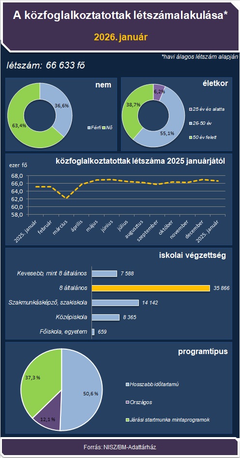 A közfoglalkoztatásban részt vevő személyek havi átlagos száma 2026 januárjában 66,6 ezer főt tett ki, amely az előző év azonos időszakához viszonyítva 2,4%-kal (1,5 ezer fővel) emelkedett.
